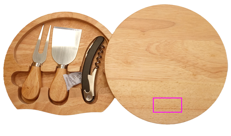 Cheese board made of wood (rubberwood),includes a cheese knife, a cheese fork, and a waiter's knife. We engrave your logo on the board.