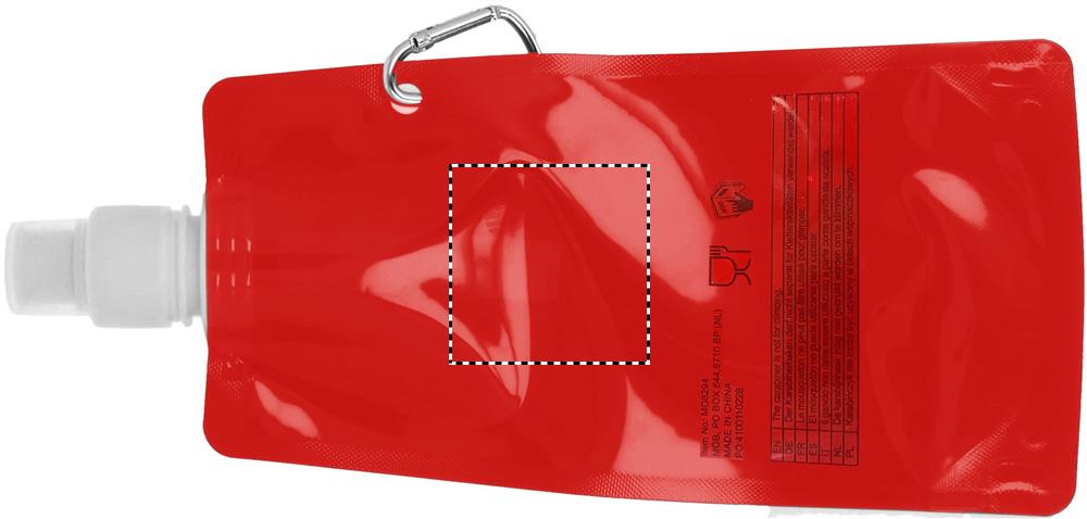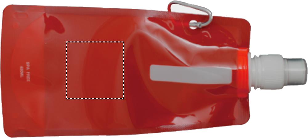 Foldable water bottle in PET which is BPA free with aluminium carabiner. Capacity 480 ml. Leak free.