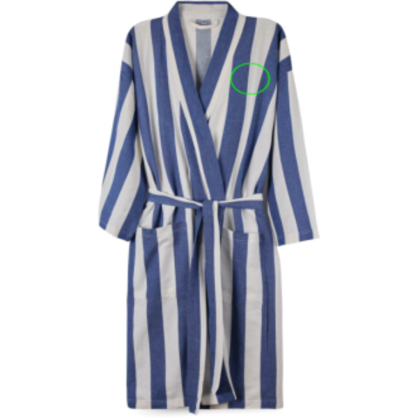 Bring this soft and comfortable hammam robe to the beach or simply enjoy it at home. Crafted from a lightweight and airy 200 gsm blend, it combines the comfort of cotton with the quick-drying benefits of polyester. Designed in a classic style with a two-tone striped pattern, it features a neat collar, front pockets, 3/4 sleeves, and a waist belt for a perfect fit. Certified by GRS (Global Recycled Standard), GRS certification guarantees that the entire supply chain of the recycled materials is certified. The total recycled content is based on the overall product weight. This product contains 69% GRS certified recycled cotton and 29% GRS certified recycled polyester.