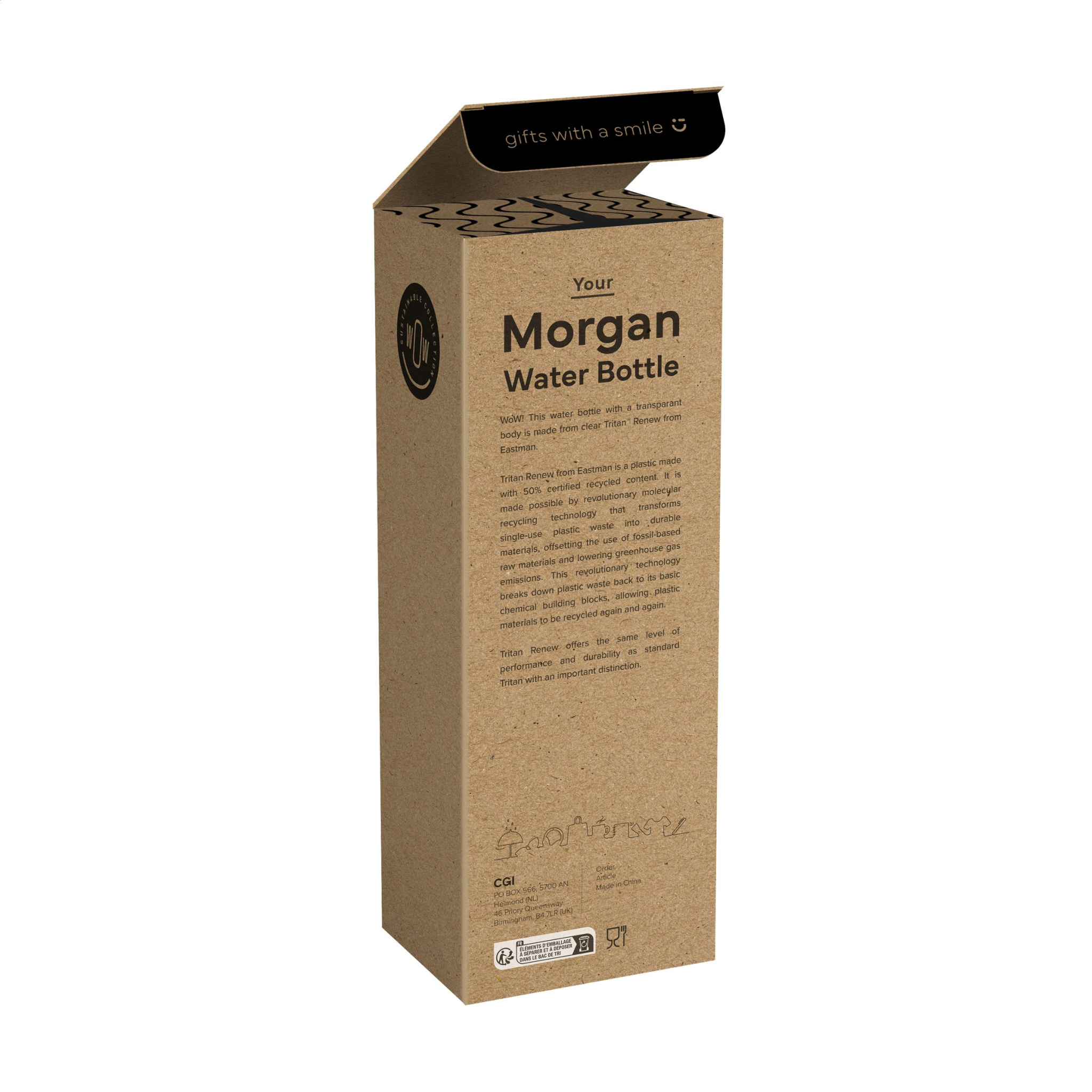 Vau! Läbipaistva korpusega veepudel, mis on valmistatud läbipaistvast Eastmani Tritan™ Renew materjalist. 50% taaskasutatud materjalist, ilma kvaliteedis järeleandmisi tegemata. Keerataval korgil on kokkupandav huulik ja suletav kõrs, mis võimaldab joomise ajal pea sirgena hoida. Nii saate lonksu juua, hoides samal ajal pilku sõidu ajal teel. Seda pudelit on lihtne ühe sõrmega kaasas kanda. Korduvkasutatav, lekkekindel ja BPA-vaba. Mahutavus 650 ml. Iga toode tarnitakse individuaalses kinkekarbis.
