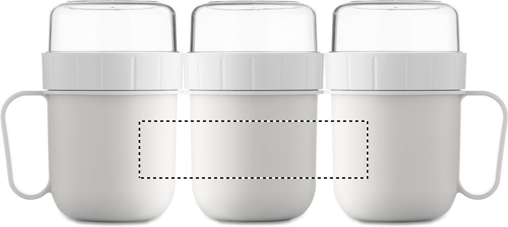 Breakfast or brunch on the go cup in PP and PS lid container. Consists of 2 individual containers to keep ingredients separate. Capacity: 450 ml and 160 ml. Leak-free.